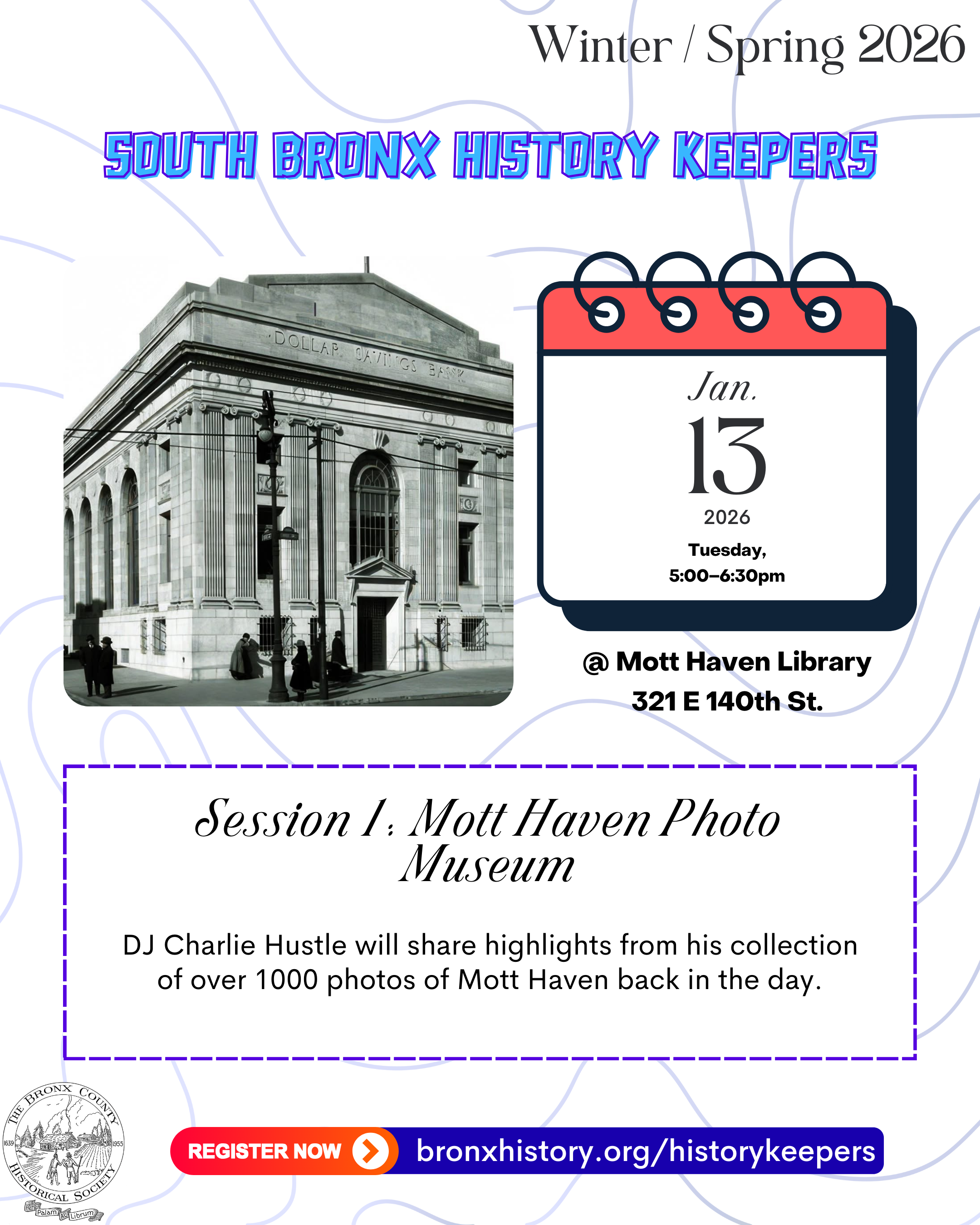 The Research Center includes The Bronx County Historical Society Research Library and The Bronx County Archives. Appointments can be scheduled with the Research Librarian/Archivist, at librarian@bronxhistoricalsociety.org or 718-881-8900 x105.